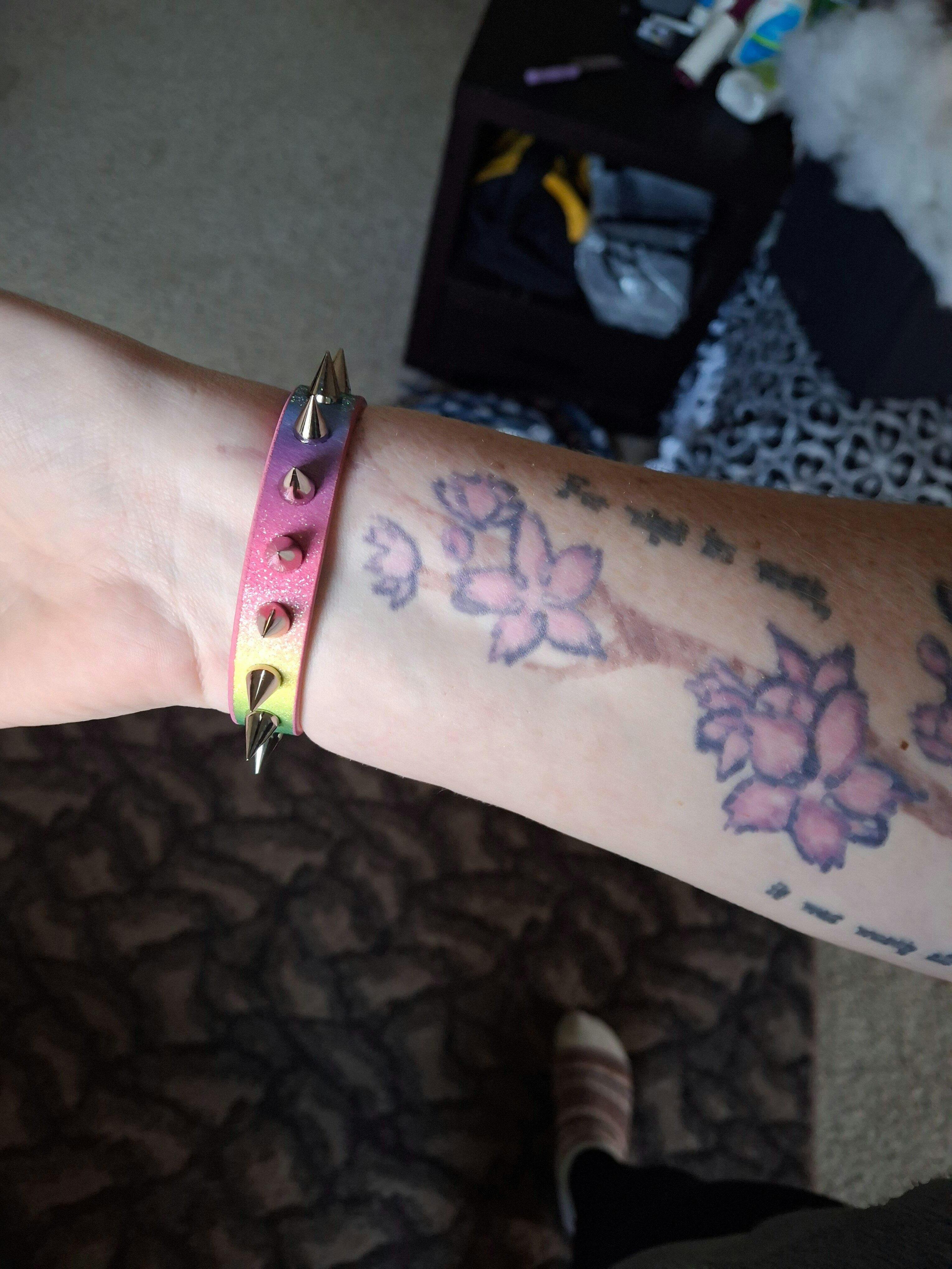 The GlitterSpit & Spite Spiked Cuff is pastel chaos with a grudge. Rainbow glitter strapping is lined and finished with small silver cone spikes, turning cotton-candy colors into real armor. Made to celebrate pride and punk defiance, each cuff is handmade from durable, vegan-friendly materials with secure hardware—ready for Pride, shows, and everyday “don’t mess with me” outfits.